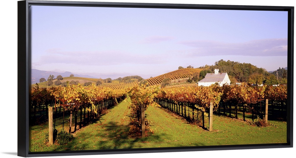 <p>Many rows of grapevines near a winery running across the sloping hills of California in the late afternoon.</p>