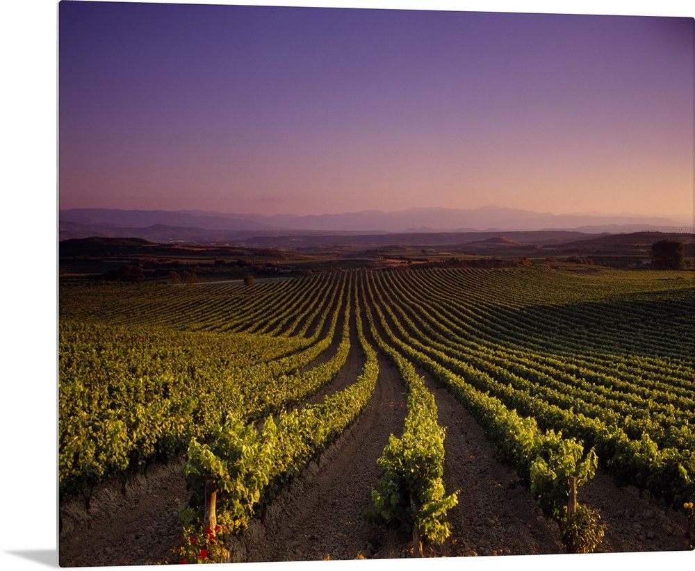<p>Horizontal photograph on a large canvas looking down the rows of a vast vineyard beneath a pastel sky at sunset in St. Tropez, Provence-Alpes-Cote Dazur, France.</p>