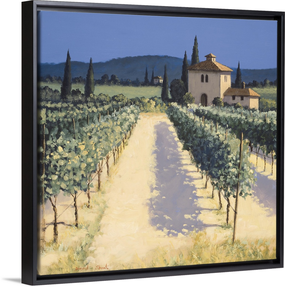 <p>Contemporary artwork of a vineyard in the European countryside.</p>