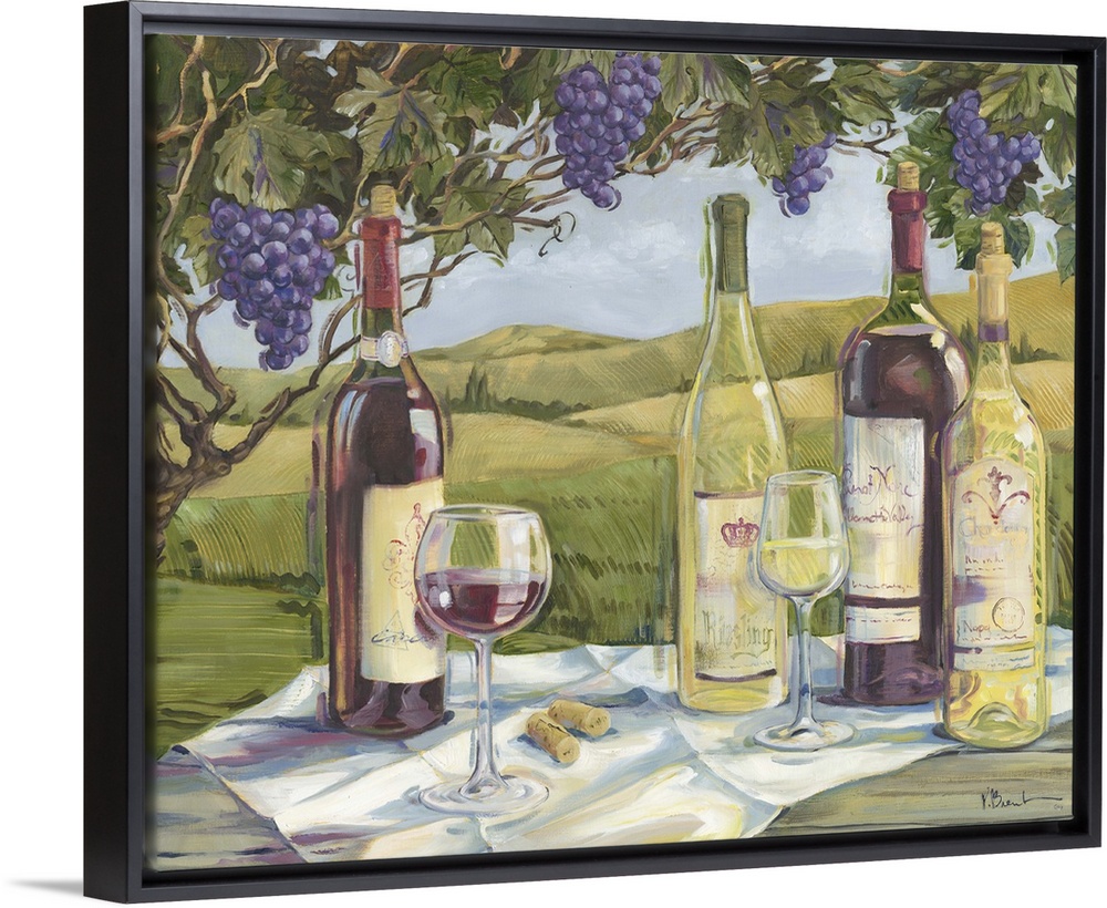 <p>Still life painting of wine bottles and wine glasses under a grapevine in a vineyard.</p>