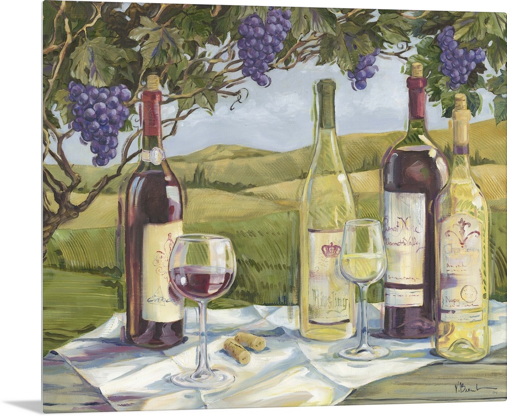<p>Still life painting of wine bottles and wine glasses under a grapevine in a vineyard.</p>