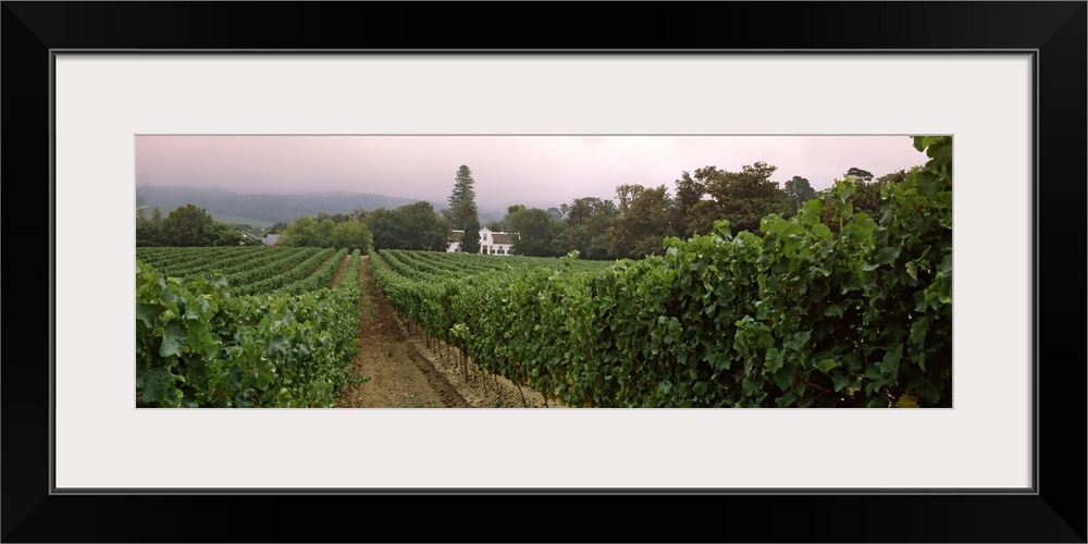 <p>Long and horizontal photo of a vineyard with rows of vines at sunset in South Africa.</p>