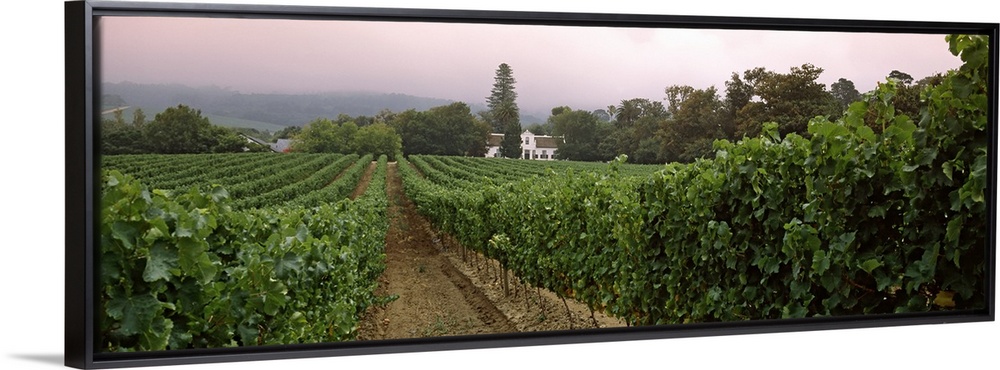 <p>Long and horizontal photo of a vineyard with rows of vines at sunset in South Africa.</p>