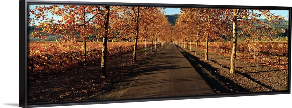 <p>Panoramic photograph of paved street lined with autumn trees.</p>
