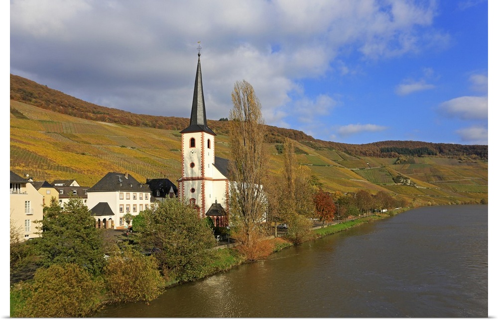 <p>Vineyards and church near Piesport, Moselle Valley, Rhineland-Palatinate, Germany</p>