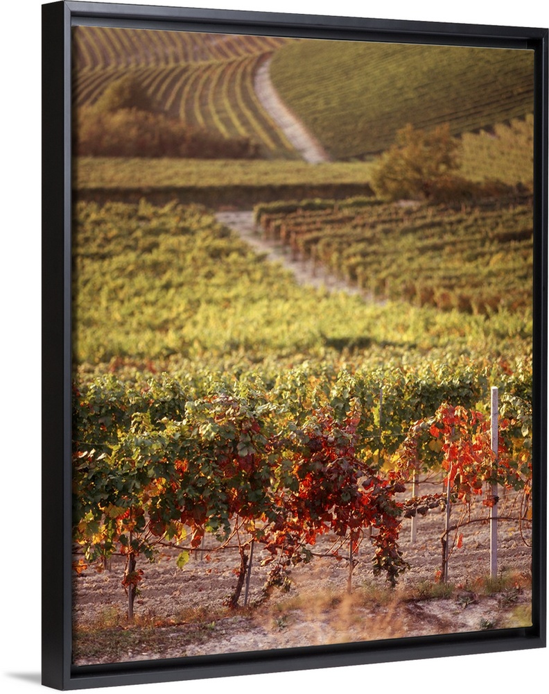 <p>A large photograph of a wine vineyard that shows vines close up and going back toward more land.</p>