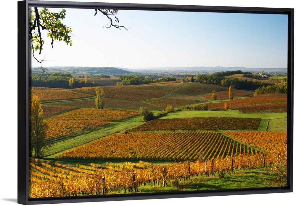 <p>A view over the vineyards in Bergerac at Chateau Belingard in evening sunshine in autumn giving the wines a golden glow Chateau Belingard Bergerac Dordogne France</p>