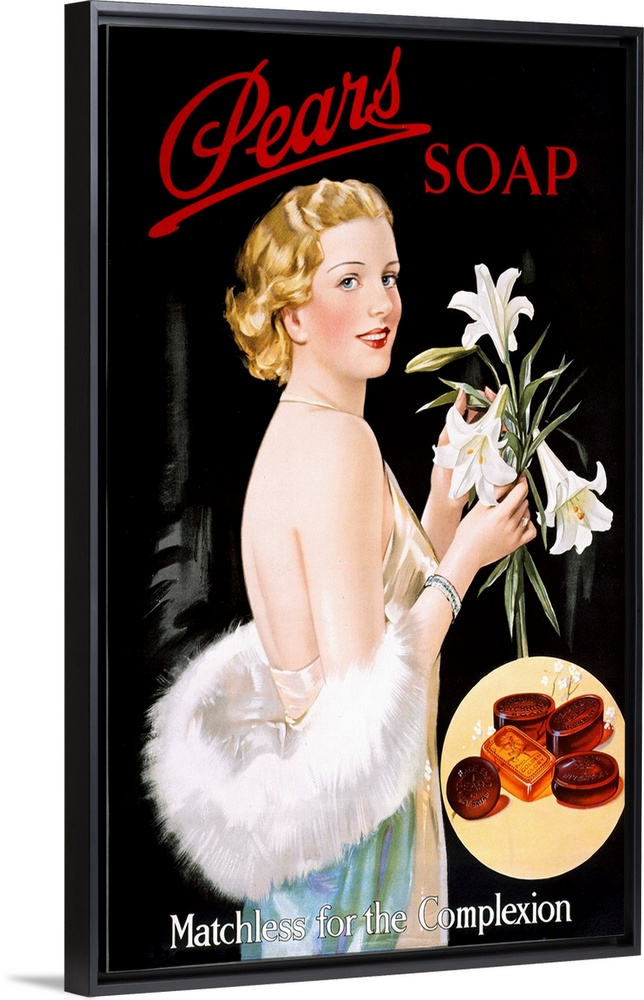 <p>a glamorous woman holding a bunch of lilies. advertisement for soap</p>