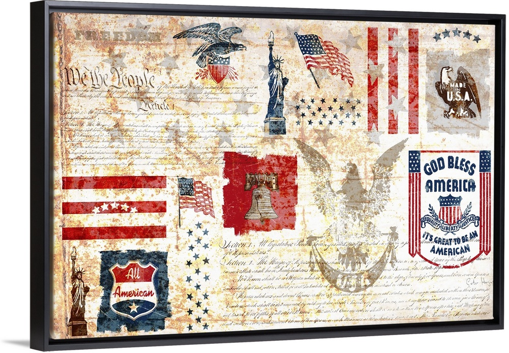 <p>Vintage rusty distressed wall art sign with typography words and images that are All-american, Made in the USA, God Bless America, on a background of the Declaration of Independence.</p>