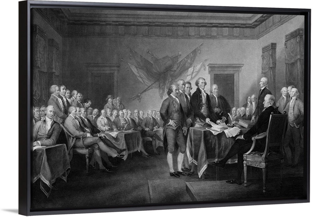 <p>Vintage American History print of Thomas Jefferson, John Adams, Roger Sherman, Robert Livingston, and Benjamin Franklin presenting the first draft of the Declaration of Independence to the Second Continental Congress. Less than a week later, on July 4, 1776, the colonial delegates signed the Document.</p>