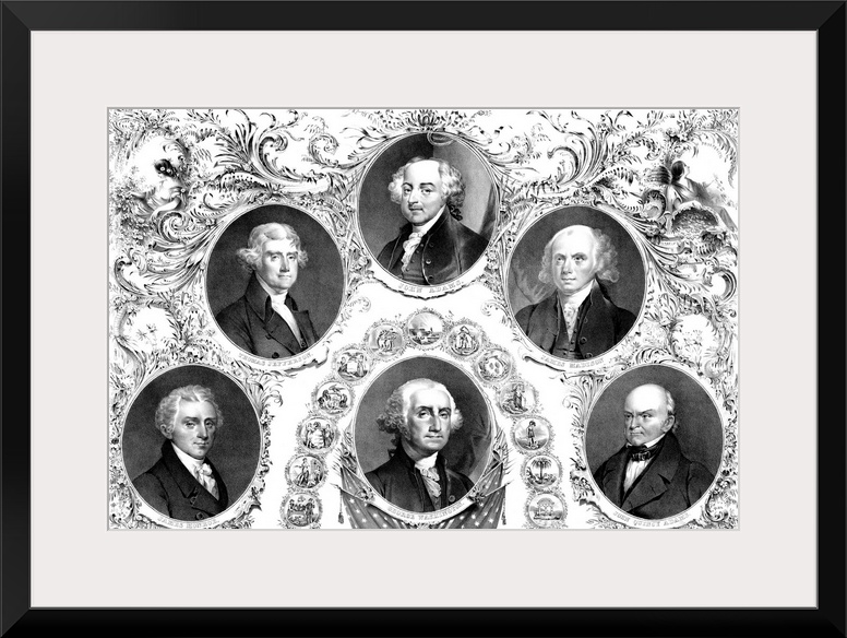 <p>Vintage American history print showing the first six Presidents of The United States of America. It features George Washington, John Adams, Thomas Jefferson, James Madison, James Monroe, and John Quincy Adams.</p>