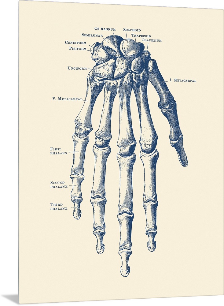 <p>Vintage anatomy print features the hand of a human skeleton with bones labeled.</p>