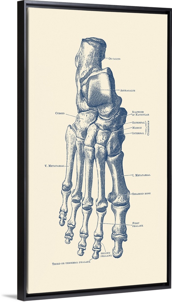 <p>Vintage anatomy print of the human right foot with each bone labeled.</p>