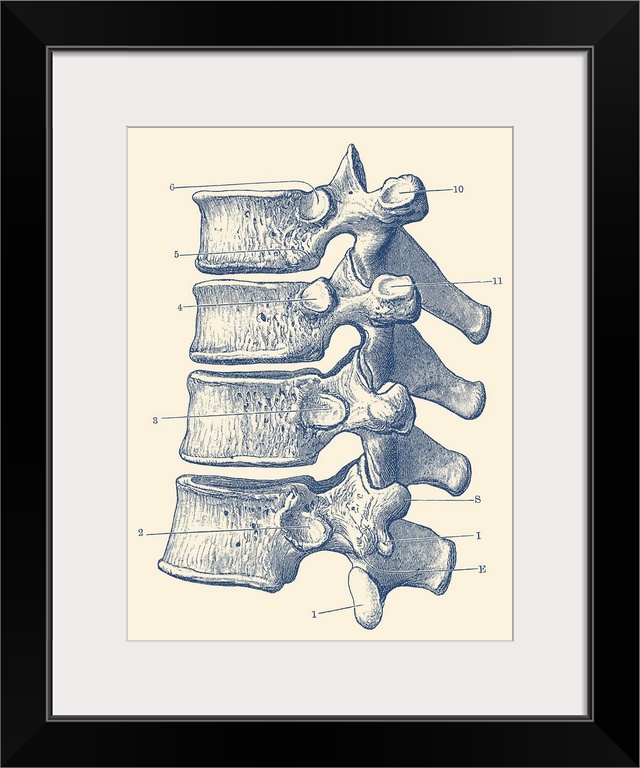 <p>Vintage anatomy print of the human spine, showcasing four vertebrae.</p>