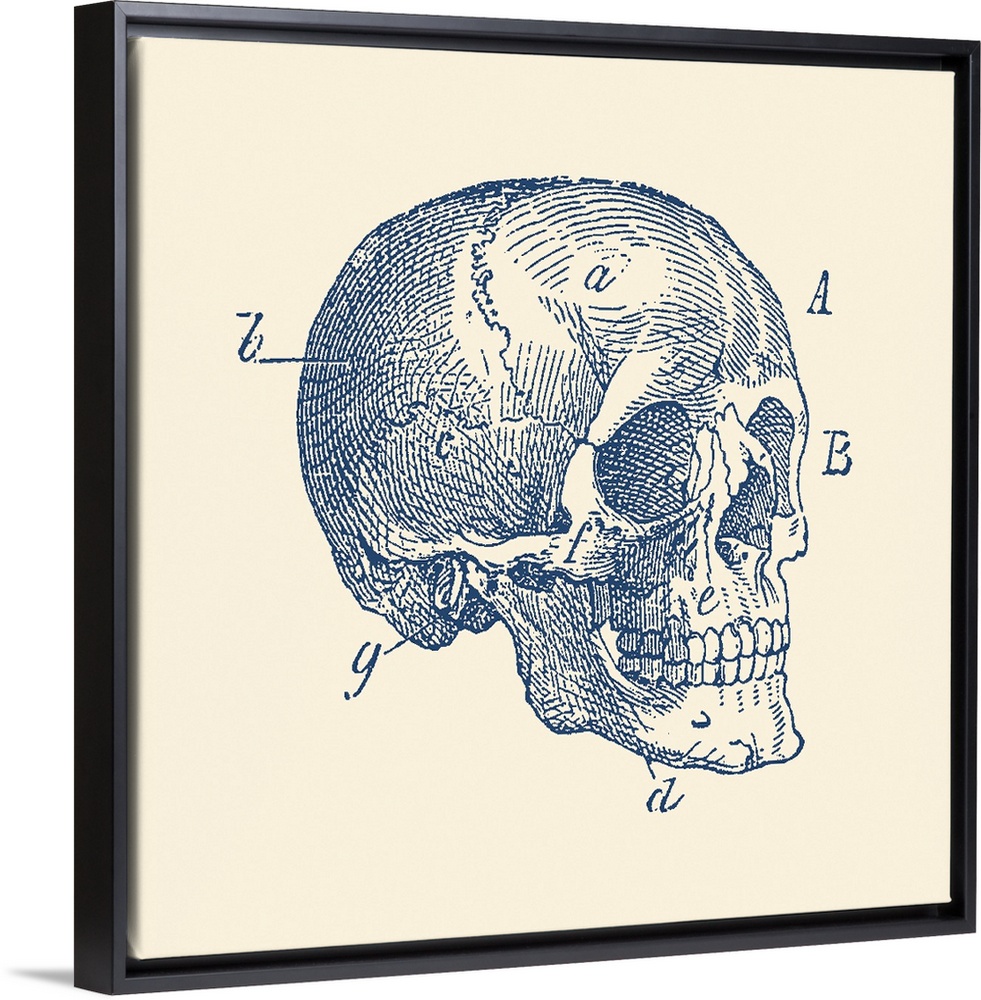 <p>Vintage anatomy print of the side view of a skull from a human skeleton.</p>