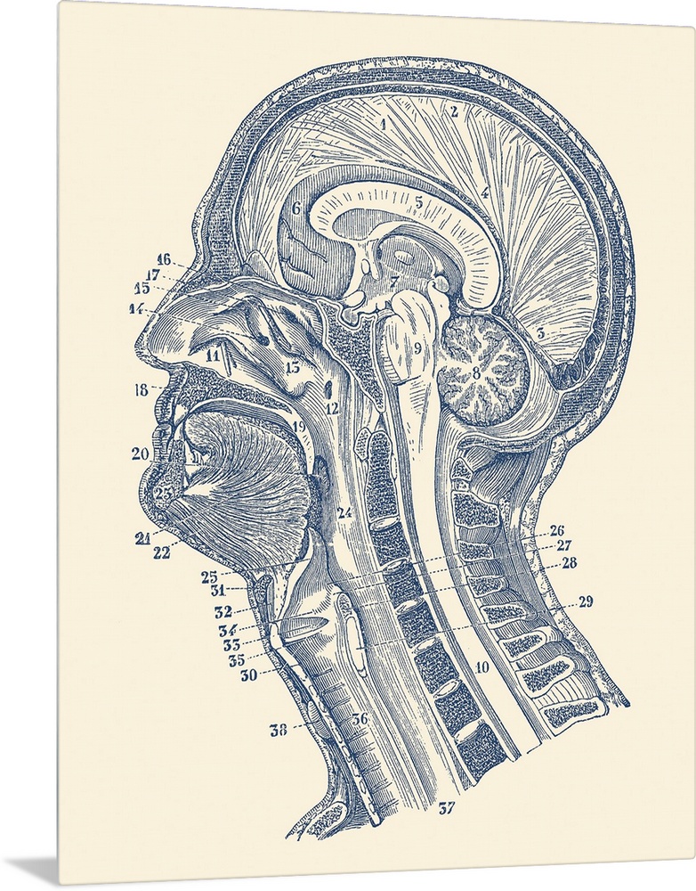 <p>Vintage anatomy print showing a diagram of the structures in and around the human brain.</p>
