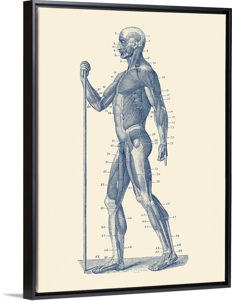 <p>Vintage anatomy print showing a side view diagram of the human muscular system.</p>