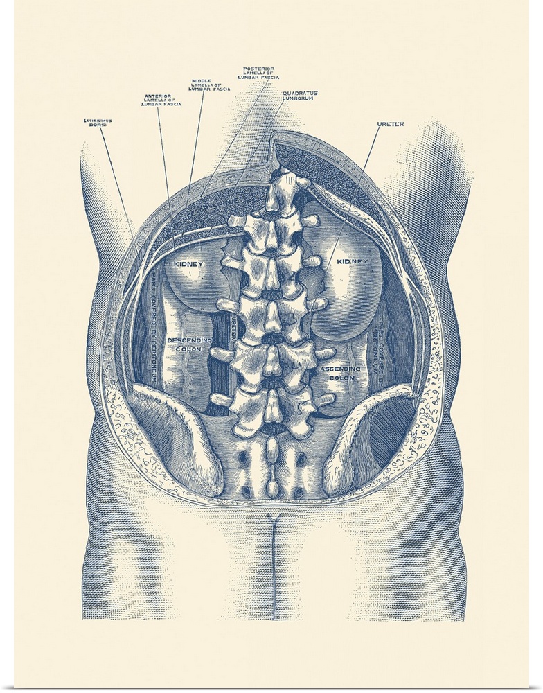 <p>Vintage anatomy print showing a view of the kidneys and colon inside the human body.</p>
