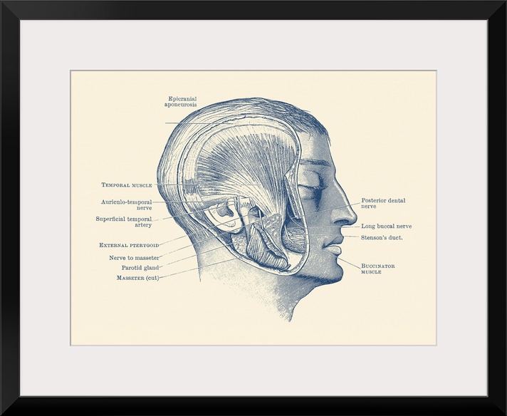 <p>Vintage anatomy print showing the different muscles, arteries and nerves within the face.</p>