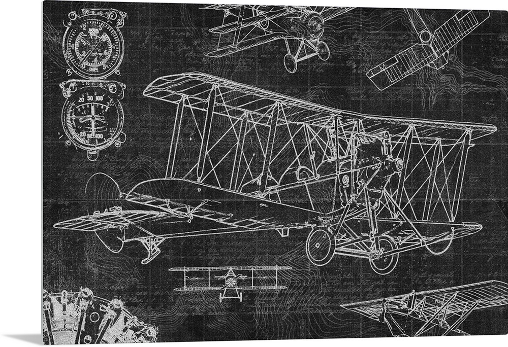 <p>Diagram of a vintage airplane on black.</p>