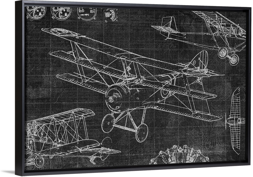 <p>Diagram of a vintage airplane on black.</p>