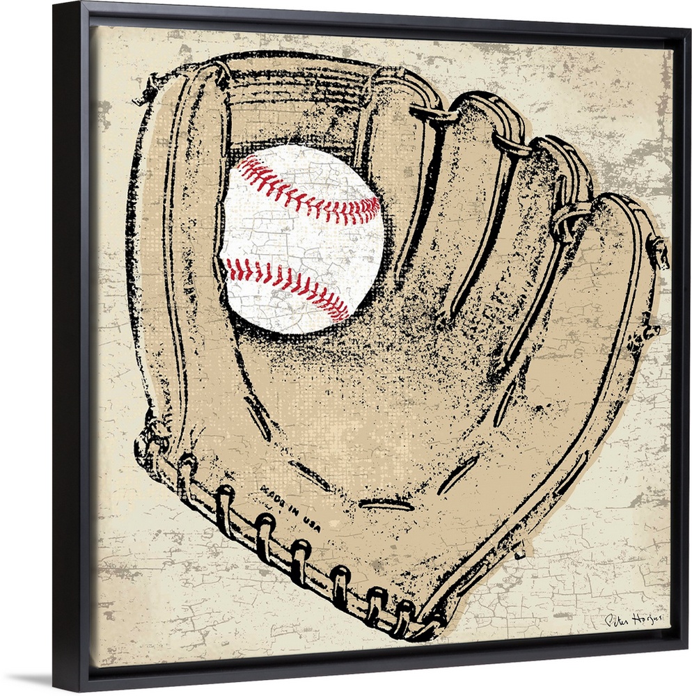 <p>Vintage style wall art of an old distressed baseball glove on tan and sepia background.</p>