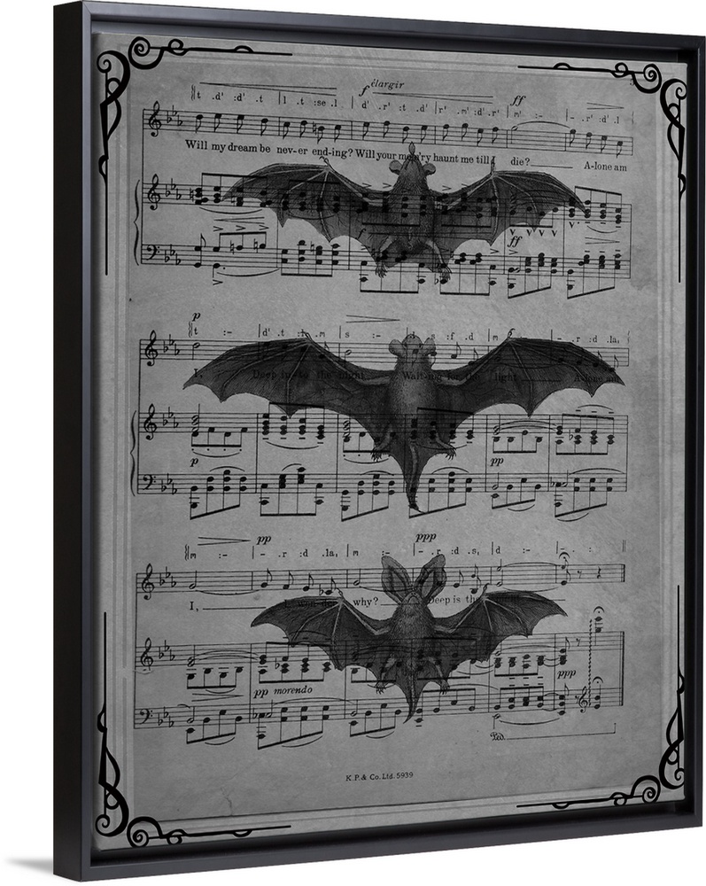 <p>Black and white vintage sheet music with three bats on top.</p>