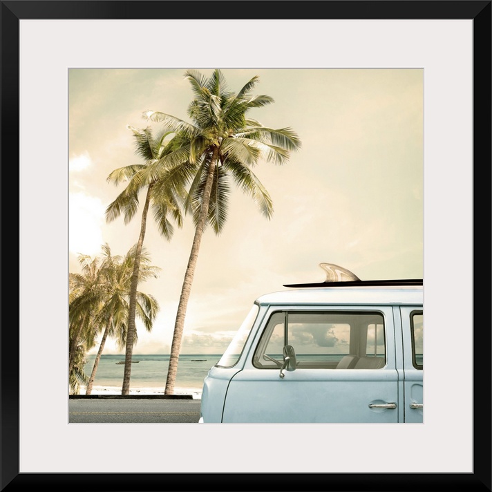 <p>Vintage car parked on a tropical beach with a surfboard on the roof.</p>
