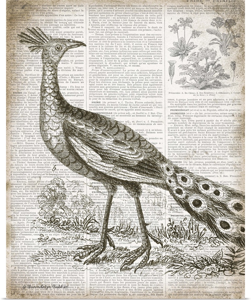 <p>Vintage illustration of a peacock on top of a page from a French text book.</p>