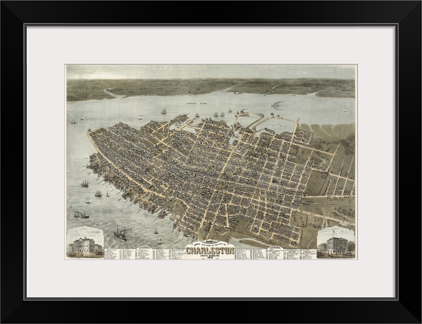 <p>Antique map of historic southern city with two images of notable buildings inset.</p>