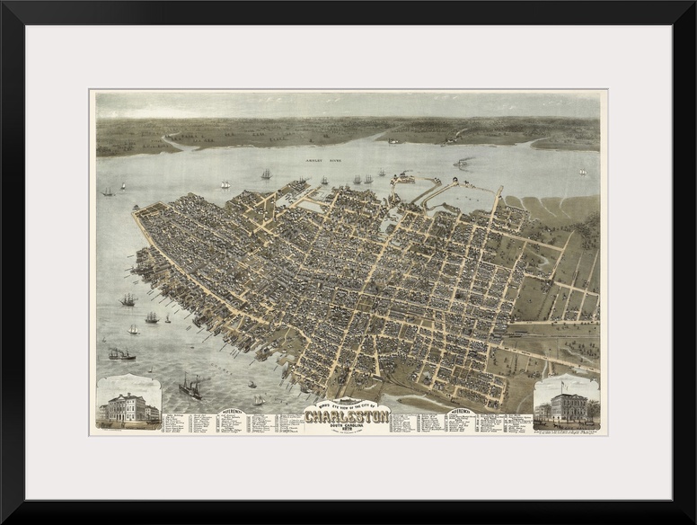 <p>Antique map of historic southern city with two images of notable buildings inset.</p>