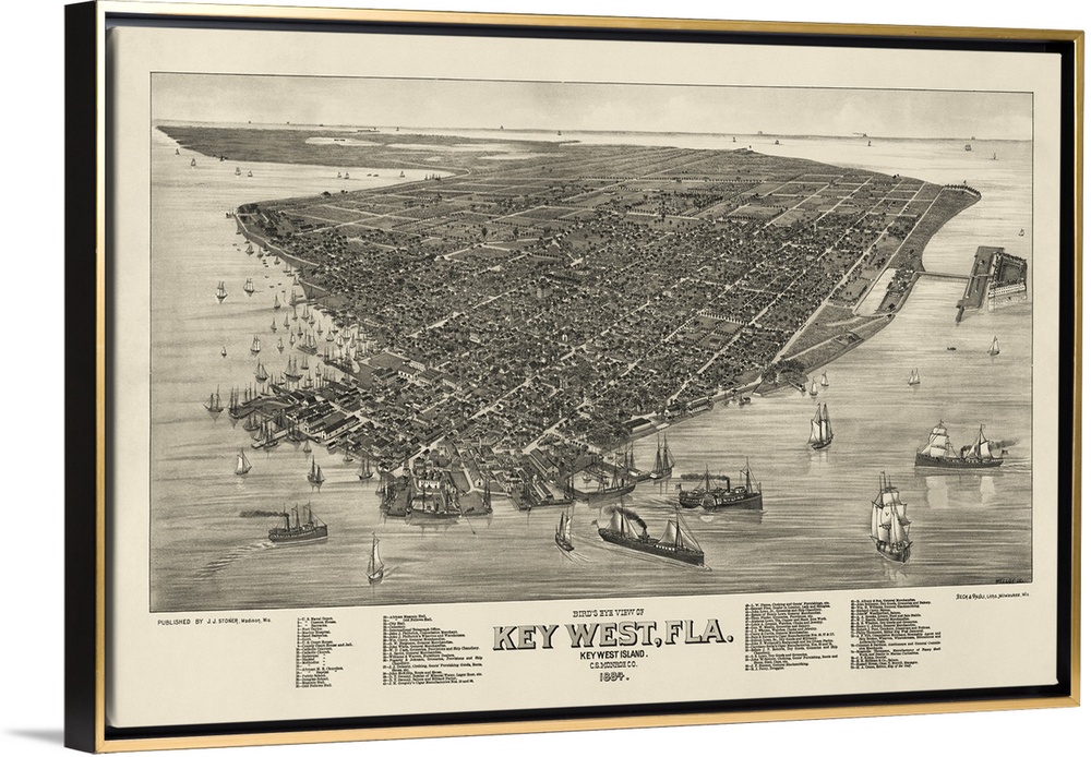 <p>Antique map featuring an aerial view of the town of Key West, Florida from 1884.</p>