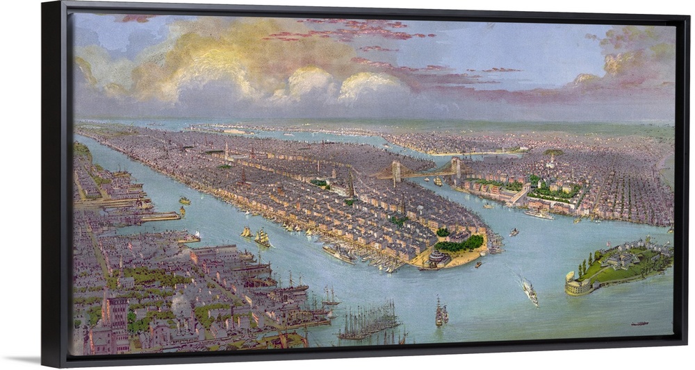 <p>This large piece is an antique birds eye view map of New York City in color.</p>