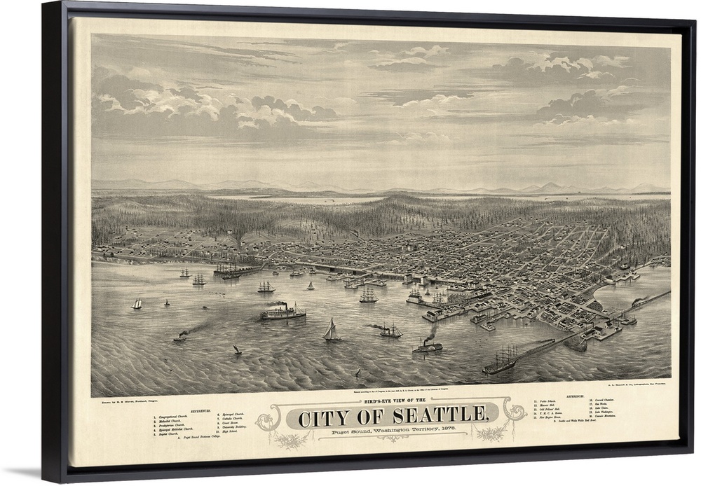 <p>This large piece is an antique map with the birds eye view of the city of Seattle from the waterfront.</p>