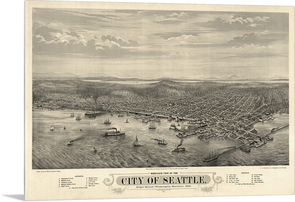 <p>This large piece is an antique map with the birds eye view of the city of Seattle from the waterfront.</p>