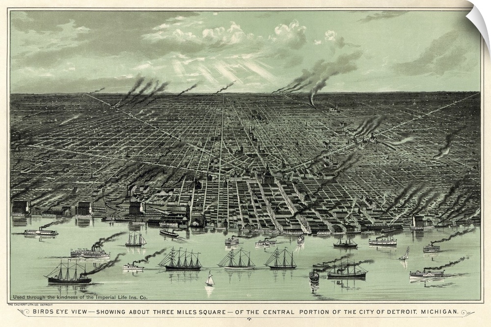 <p>This oversize piece is an antique map of the city of Detroit with the water shown just in front filled with boats and ships.</p>