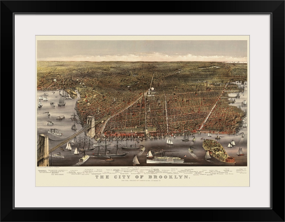 <p>This large piece is a vintage map of the city of Brooklyn. The water that surrounds the city is filled with various boats and ships.</p>