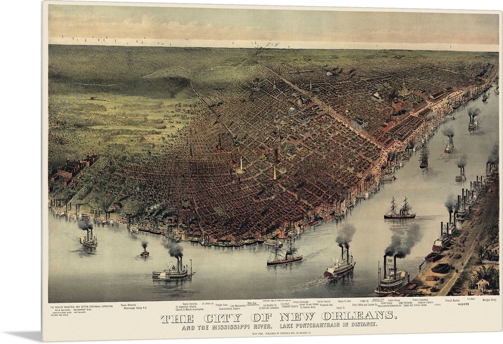 <p>Huge antique illustration shows an aerial view of a famous city within Louisiana as it sits next to the Mississippi River filled with an assortment of boats. Notable landmarks within this illustration include the U.S. Mint, Jackson Square, and Canal Street.</p>