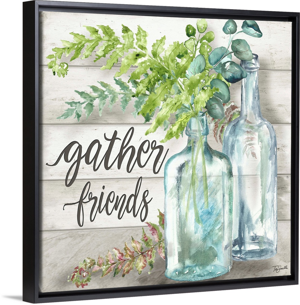 <p>"Gather Friends" with glass bottles and greenery on a gray wood panel background.</p>