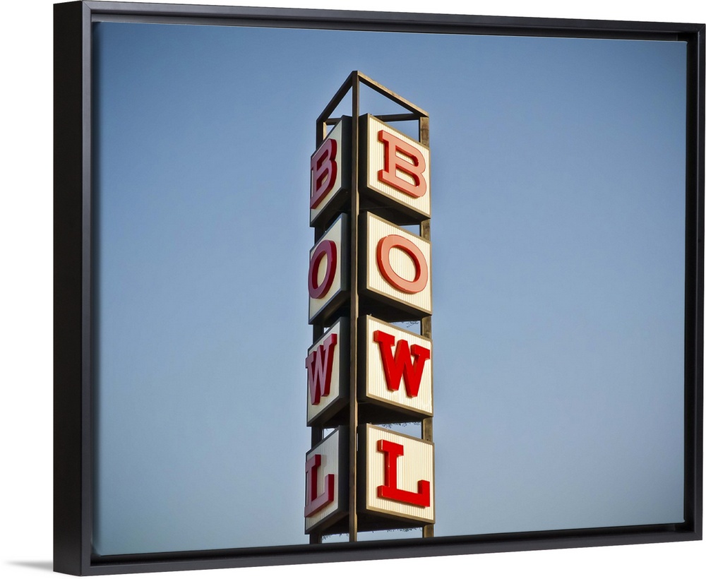 <p>Photograph of a retro bowling sign against a clear blue sky.</p>