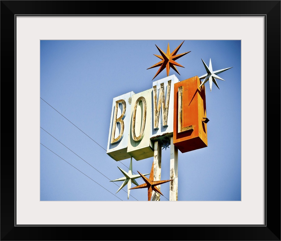 <p>Photograph of a retro bowling sign against a clear blue sky.</p>