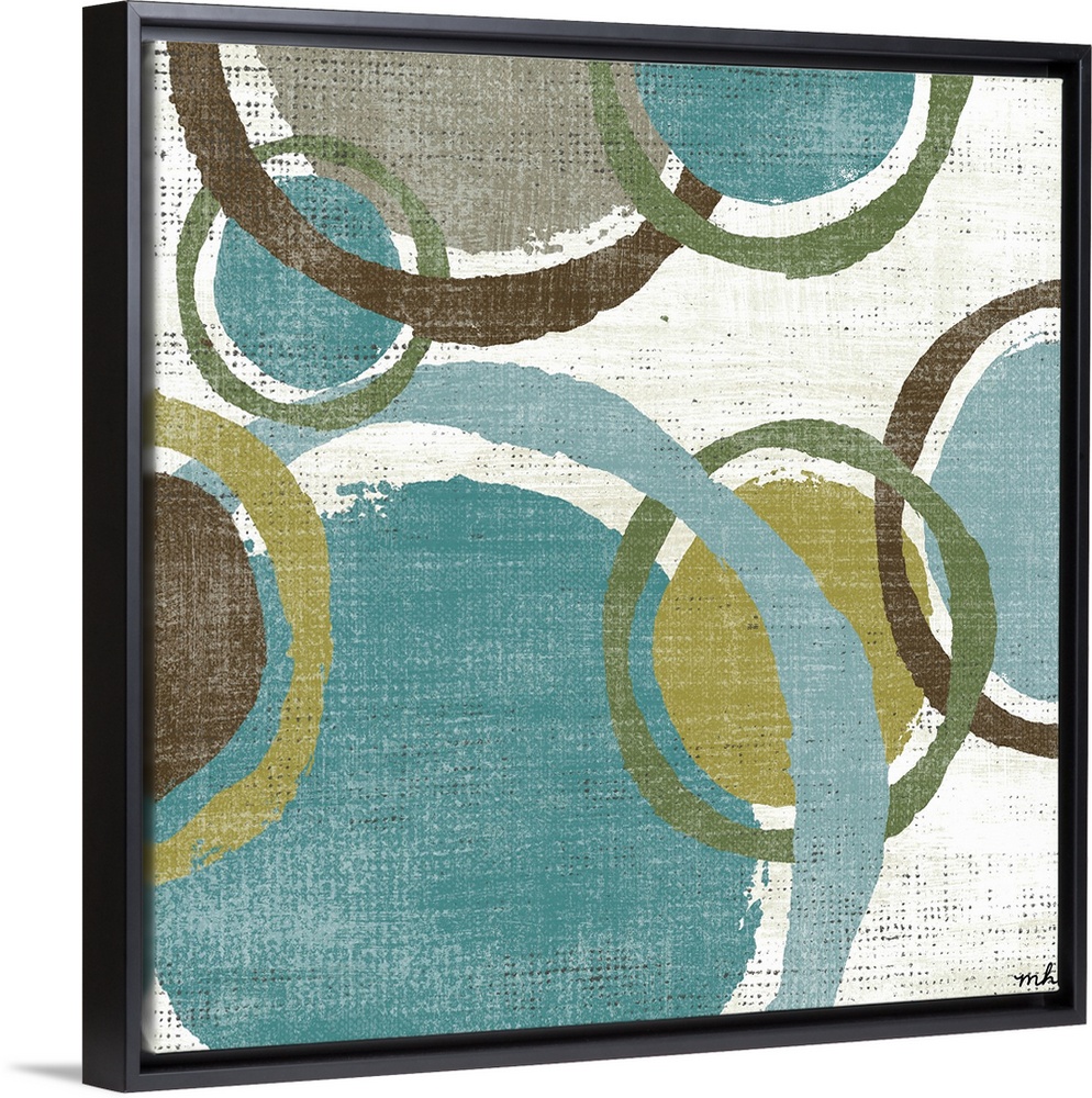 <p>Contemporary docor art of a set of cool-colored circles and rings floating on a textured white background.</p>