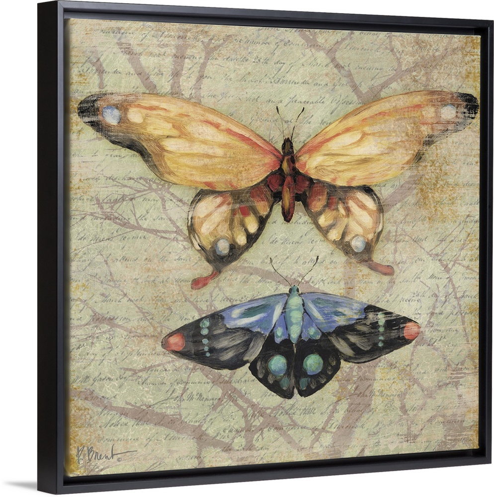 <p>Square panel with two butterflies over handwritten text and silhouettes of branches, done in a vintage style.</p>
