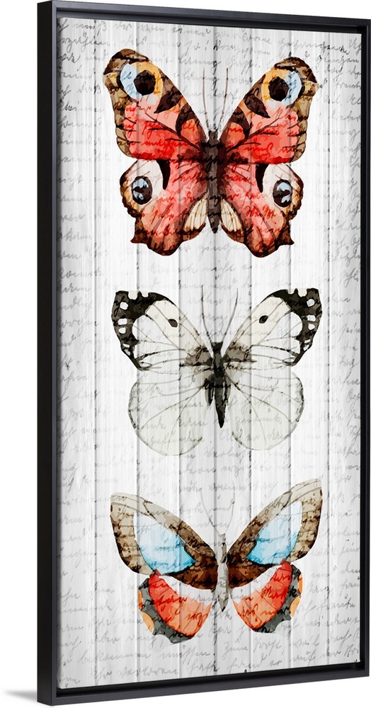 <p>Three butterflies painted vertically on a wooden paneled background with faded handwriting on top.</p>