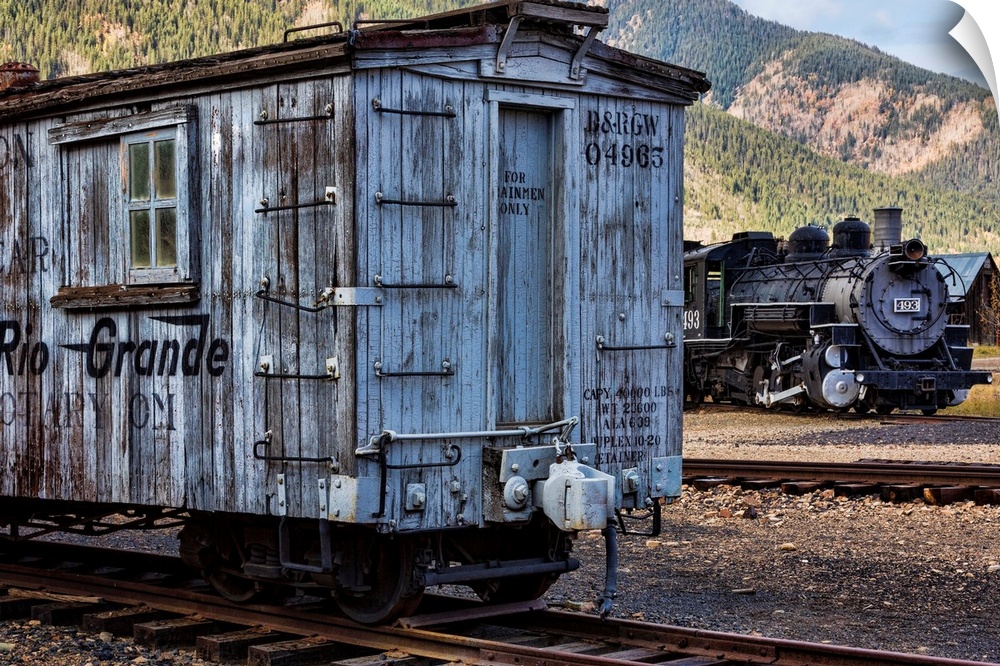 <p>Photograph of a vintage train car on the railroad tracks.</p>
