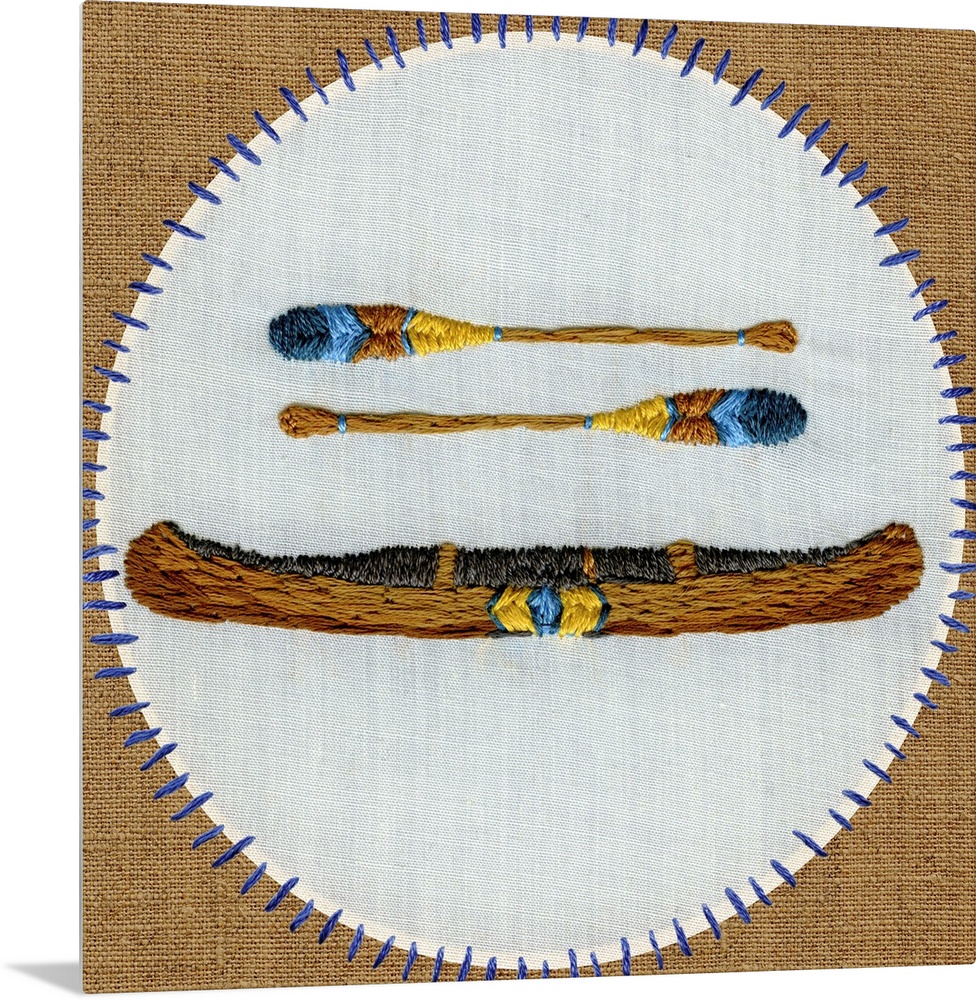 <p>Contemporary embroidered artwork of a canoe sewn onto a white circle against a brown background.</p>