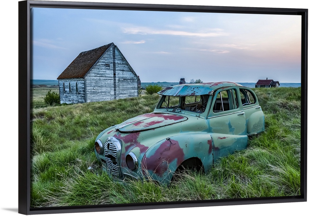 <p>Vintage car sitting in the overgrown grass in a field with old buildings on a farmstead; Saskatchewan, Canada</p>