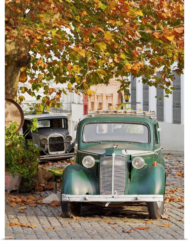 <p>Uruguay, Colonia Department, Colonia del Sacramento, Vintage cars on the cobblestone lane of the historic quarter.</p>