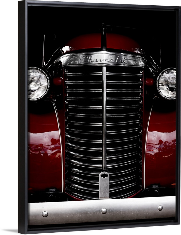 <p>Beautiful dark reds and reflected tones draw the viewer to this vivid contemplative photograph featuring strong geometry captured focusing on a creative detail view of an antique Chevrolet fire truck gril, headlights and fender.</p>