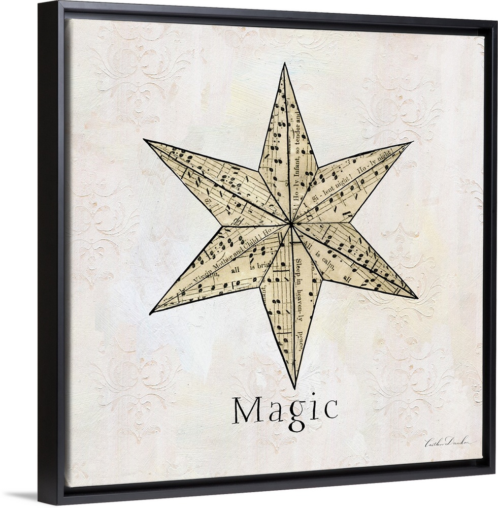 <p>"Magic" along with a star silhouette made of sheet music on a floral etched neutral background.</p>